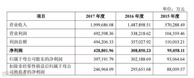 财务数据显示,2015年-2017年,宁德时代营业收入分别为57.03亿元、148.79亿元及199.97亿元,年均复合增长率高达87.26%;净利润分别9.51亿元、30.89亿元及42.88亿元,年均复合增长率高达112.39%。