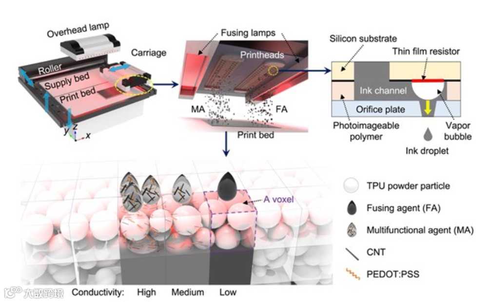 三维 (3D) 体素打印可以在一个打印部件的体素尺度上实现材料和属性的特定位置变化,但目前仅限于构建具有不同机械性能和颜色的体素化部件。鉴于此,南洋理工大学Kun Zhou等研究人员报告了使用由新开发的多功能剂 (MA) 实现的多喷射融合3D体素打印的体素化导电弹性体的设计和制造。