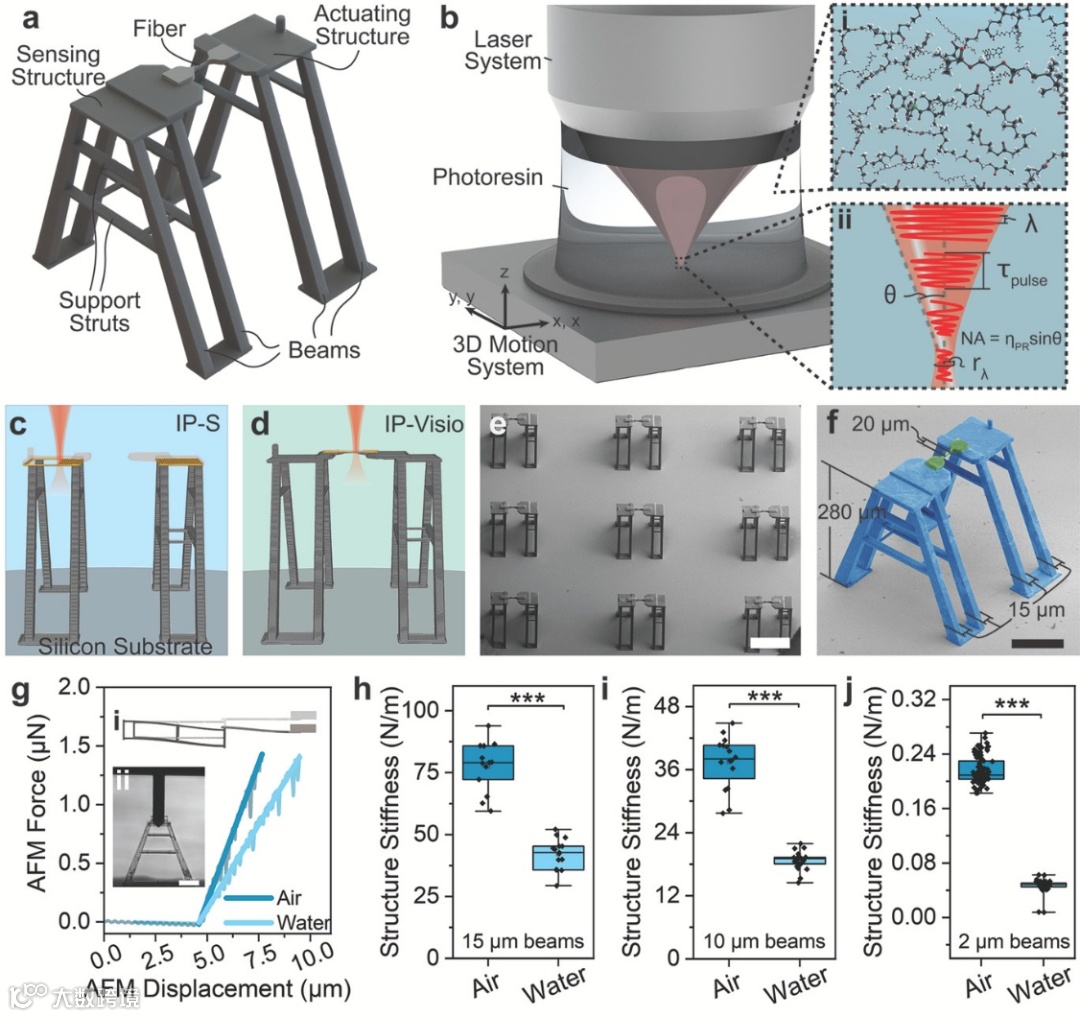 双光子聚合 (TPP) 被广泛用于创建用于生物和机械生物学研究的3D微米和纳米级支架,这通常需要对 TPP 制造结构进行机械表征。为了满足生理要求,大多数机械表征需要在液体中进行。然而,由于传统的微米级和纳米级机械测试方法的限制,以前对TPP制造结构的表征都是在空气中进行的。鉴于此,内布拉斯加大学林肯分校Ruiguo Yang、德克萨斯大学安东尼奥分校Wei Gao以及橡树岭国家实验室Nickolay V. Lavrik等人报告了一种新的实验方法,用于测试 TPP 打印的微纤维在液体中的机械性能。