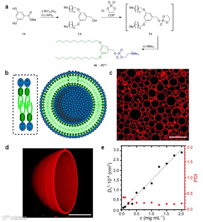 构建细胞膜的功能模拟物是合成细胞发展的一项重要任务。到目前为止,脂质和两亲嵌段共聚物是最广泛使用的两亲物,前者的双层缺乏稳定性,而后者的膜通常具有非常缓慢的动力学特征。鉴于此,德国莱布尼兹材料研究所Cesar Rodriguez-Emmenegger等研究人员介绍了一种新型的 Janus 树枝状大分子,它含有一个两性离子型磷酸胆碱亲水性头基 (JDPC) 和一个 3,5-取代的二氢苯甲酸酯基疏水性树枝状大分子。