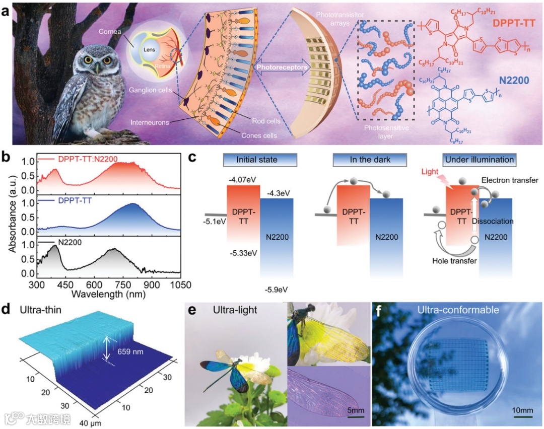 自然界中发现的各种生物眼睛视觉系统可以为近红外 (NIR) 成像设备提供有吸引力的设计灵感。视网膜的突出特点是它的凹半球几何形状和高灵敏度的图像采集,简化了眼睛的光学复杂性,提高了视觉感知的成像质量。然而,由于半球状结构、组成材料和传统成像模块的局限性,开发具有这些特性的高性能近红外仿生成像系统极具挑战性。于此,东北师范大学汤庆鑫、赵晓丽等人介绍了一种基于超柔性全聚合物异质结近红外光电晶体管的半球形仿生眼睛成像系统。