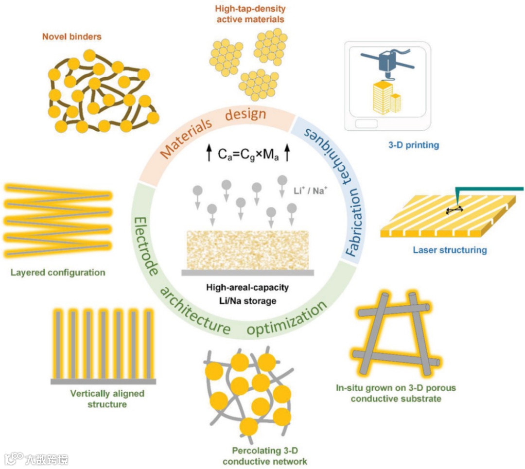 2)已经提出了新的结构设计来提高面积容量。例如,高振实密度的活性材料通常表现出相对较低的重量容量,因此在薄膜电极中很少报道,但是它是改善质量负载和实现高面积容量的有效策略。关于电极制造方法,物理气相沉积或原子层沉积等技术通常用于薄膜制造,很少有报道制造厚电极。相反,在与面积容量相关的研究中,更多的研究关注粉末挤压成型、相转化法和放电等离子烧结等新型制造方法。