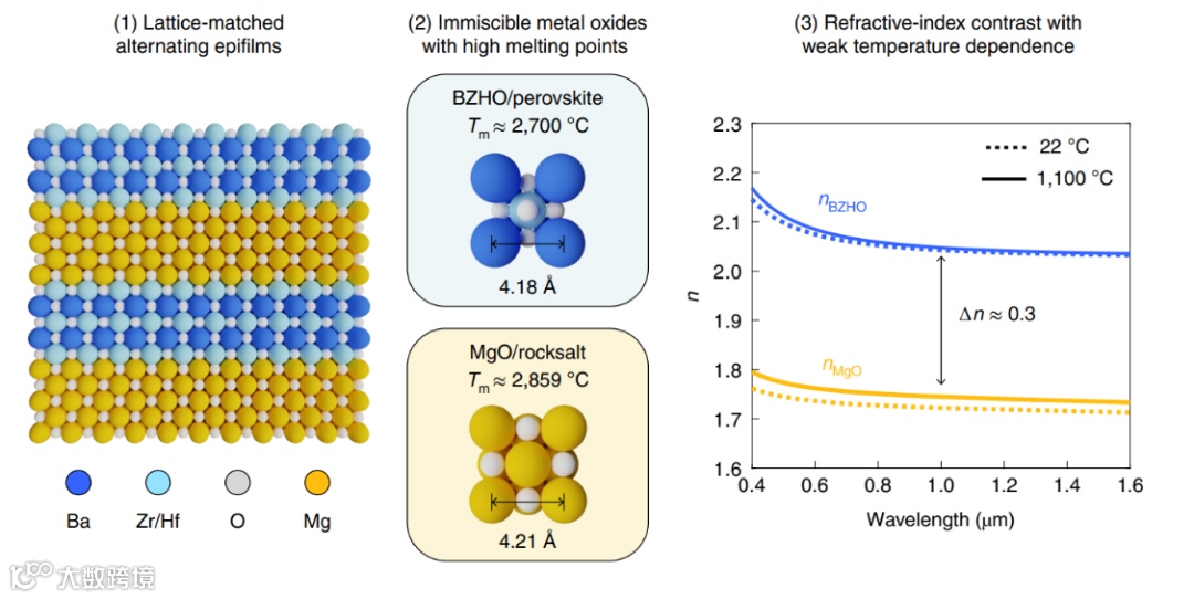 通过改变光谱以及方向能够控制纳米光子材料的热发射(thermal emission),但是这种热发射在高温氧化性环境中难以保持较好的稳定性。因此限制了热发射效应用于固态能量转换以及隔热涂层。有鉴于此,密歇根大学Andrej Lenert、John T. Heron等报道BaZr0.5Hf0.5O3 (BZHO)和MgO的外延异质结在空气气氛的稳定温度达到1100 ℃,而且在长时间暴露于这种极端环境后,仍然能够保持异质结构和清晰明确的折射角失配多层结构。