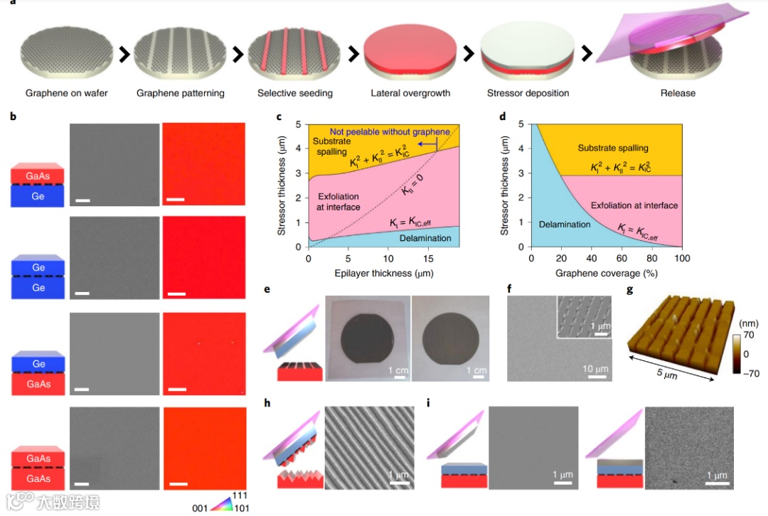 1)由于石墨烯纳米图案的柔韧性和化学惰性优势,实现了一种独特的机理能够减少晶格/极性不匹配异质结材料的错配位错、穿线位错和反相界等缺陷结构。发展了一种综合性的力学理论,能够非常精确的引导形成穿越石墨烯层的裂缝结构,展示了在石墨烯纳米图案剥离外延生长层的普适方法。