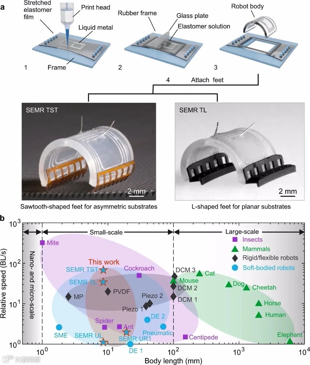 自然生物(如猎豹、兔子或蟑螂)以高速移动用于捕食或躲避捕食者。以体长计的相对速度(BL/s)可量化它们的移动速度,其中加州螨虫可达323 BL/s。而传统技术通过大型机械(BL>100 mm)和大功率发动机(如内燃机或电动机)实现高速运动,如f1赛车(50 BL/s)或四足机器人(9.1 BL/s)。由于传统高性能电机和传动系统的小型化困难,高速小型机器人的设计具有挑战性。由智能材料制成的简单结构为制造小型化机器人提供了另一种可能性。锆钛酸铅和形状记忆合金是两种典型的用于毫米级机器人的刚性智能材料,但其驱动行程太小或频率较低,无法实现高速运动。新兴的机器人和人机交互还需要软、安全、快速和鲁棒的设计,能够在恶劣的动态环境中操作。为了解决这些问题,机器人软智能材料(如热响应聚合物纤维、pH响应聚合物凝胶、光响应液晶聚合物和电场/磁场响应材料等)已经出现。然而这些软智能材料存在诸多缺点,如热和pH响应速度慢、介电弹性体驱动电压太高、软磁弹性体在多模块/群机器人设计中存在困难等。而软电磁执行器由嵌入在弹性衬底中的液态金属线圈组成,具有更好的局部可控性,在强静态磁场中具有高性能。液态金属3D打印技术的进步使软电磁执行器小型化到毫米尺度,为微米到厘米大小的高速移动开辟了道路。