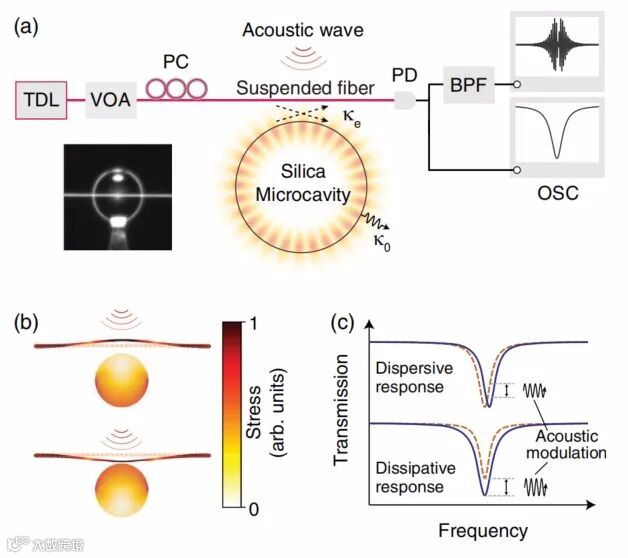 以往的研究主要依赖于声光色散作用,即声波调制折射率,改变腔体几何形状,从而导致共振位移。声光相互作用的完整描述包含耗散项,其中声波调制腔衰减率,改变光模式的线宽。然而,与色散相互作用相比,它的探索是滞后的,因为耗散贡献通常太弱而无法观测到。研究人员已经努力利用机械共振来增强耗散耦合,然而,在机械共振中,对离散和窄共振的精确控制需要依赖于悬浮分束纳米腔和辐条微磁盘等微妙的结构。