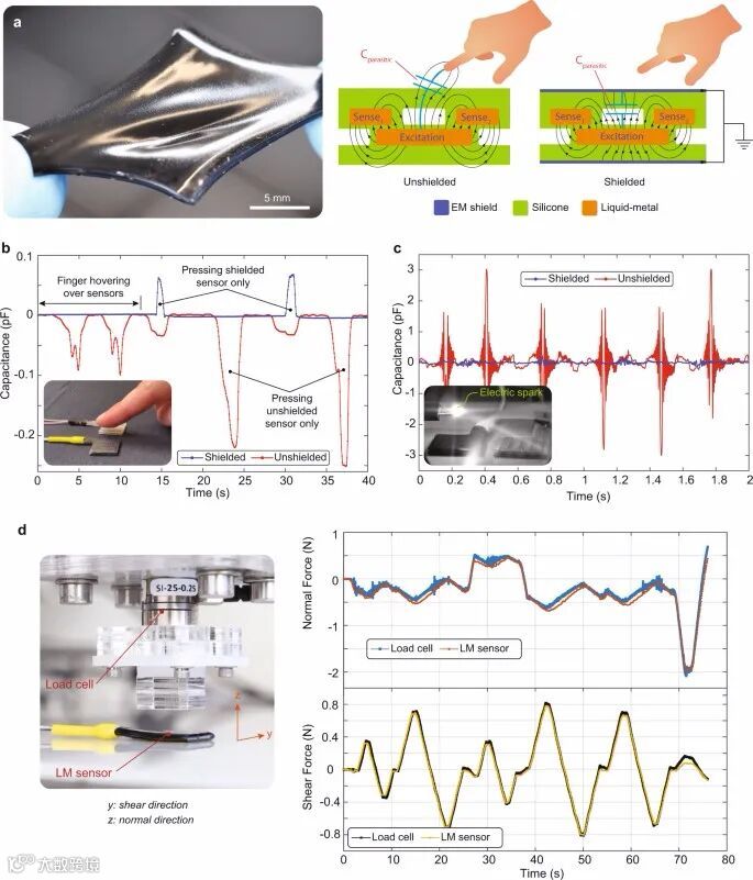 软力和应变传感器能够为诸多领域提供所需的感知,例如人机交互、可穿戴电子设备、和健康监测系统等。这些软传感器具有机械兼容性,可以安装在非平面表面上,并且不会阻碍运动。这些功能是使软机器和可穿戴设备能够智能地响应周围环境的关键。在传感原理中,电容传感由于其低功耗(驱动电流在µA范围内)、快速响应、相对简单的读出和简便的制造工艺而被广泛采用。然而,电容式传感器非常容易受到运动或附近物体的存在以及低水平电磁(EM)干扰的影响。尽管有大量研究和众所周知的外部干扰效应,但现有的软电容传感器缺乏允许在移动导体、电机或其他时变电场源附近运行所需的电磁屏蔽。这将软电容传感器的使用限制在具有严格控制环境的实验室环境中。