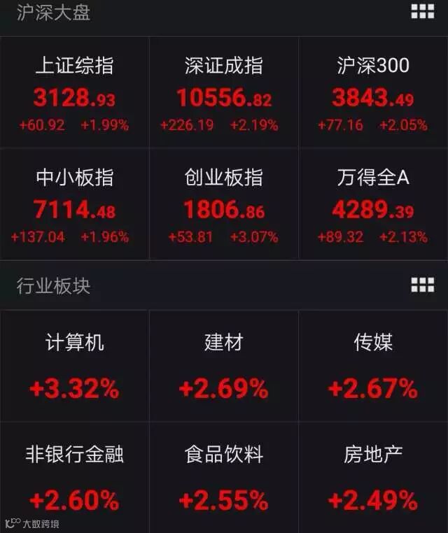 4月24日,A股市场迎来迎来久违的大涨,而且是蓝筹与成长板块的普涨。其中,沪综指单日涨幅达1.99%,创2月23日以来单日最大涨幅;深证成指单日涨幅亦高达2.19%,创2月13日以来单日最大涨幅;创业板指单日涨幅高达3.07%。