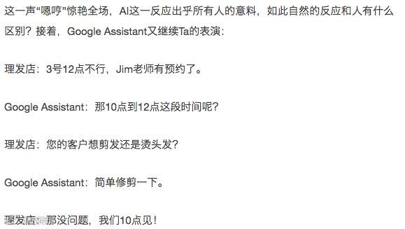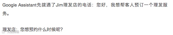 整段对话,Google Assistant表现的自然流畅,理发店那头丝毫没有察觉到自己竟然是在和AI对话。