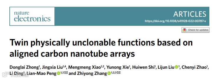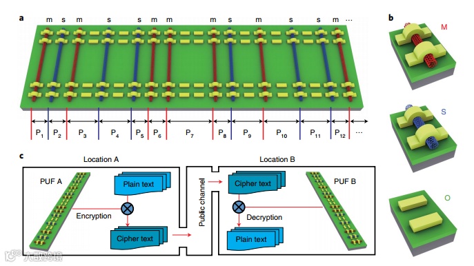 图1:基于对齐碳纳米管carbon nanotubes,CNT阵列的双物理不可克隆函数Physically unclonable functions,PUF及其在安全通信中的应用。