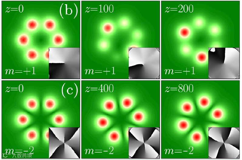 具有离散角旋转对称结构的环形波导阵列在高能脉冲传输、压缩以及光束组合方面非常重要。它们支持并限制多类光涡旋的存在形态。至关重要的是,顺时针和逆时针涡旋态在这类系统中具有完全对称的特征。因此在线性或非线性区域中,具有相反拓扑荷的状态都具有相同的性质。在玻色--爱因斯坦凝聚体和驱动极化子微腔中也观察到了具有相反拓扑荷的涡旋态的类似对称性和等效性。