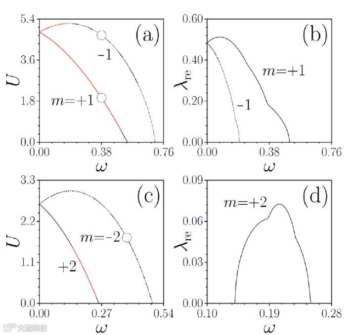 图2:涡旋孤子功率(a,c)功率和不稳定增长率(b,d)随旋转频率的变化