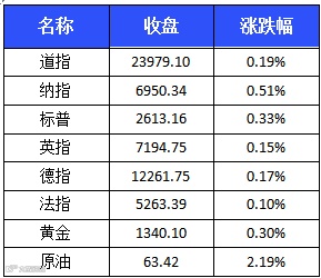 美股周一小幅收涨。标普500指数收涨8.69点,涨幅0.33%,报2613.16点。道指收涨46.34点,涨幅0.19%,报23979.10点。纳指收涨35.23点,涨幅0.51%,报6950.34点。