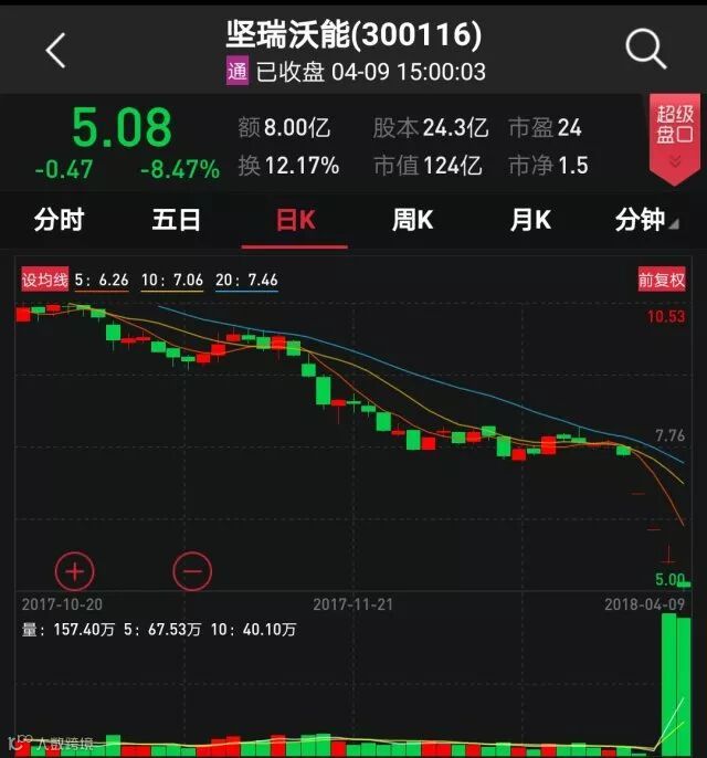 坚瑞沃能9日早间公告,将推动全资子公司沃特玛以物抵债来还清供应商货款,涉及金额逾18.48亿元。公司全资子公司沃特玛作为动力电池生产制造企业,错判新能源行业政策形势,激进扩张令现金流出现问题,导致公司目前的危机。公司股价4月2日复牌后连续3个交易日跌停,9日再度大跌8.47%。不过公司相关人士表示,沃特玛正在积极自救,已经有所进展,和供应商的协调沟通顺利。