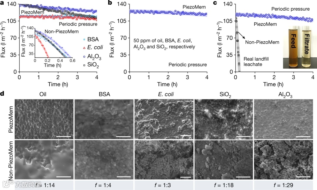 1. 为了研究PiezoMem防污性能的更广泛的适用性,本文用一系列常见的污物来测试该系统(平均孔径130 nm),包括蛋白质、微生物、胶体和SiO2−(571.2 nm,−25.9 mV)(图3a)。