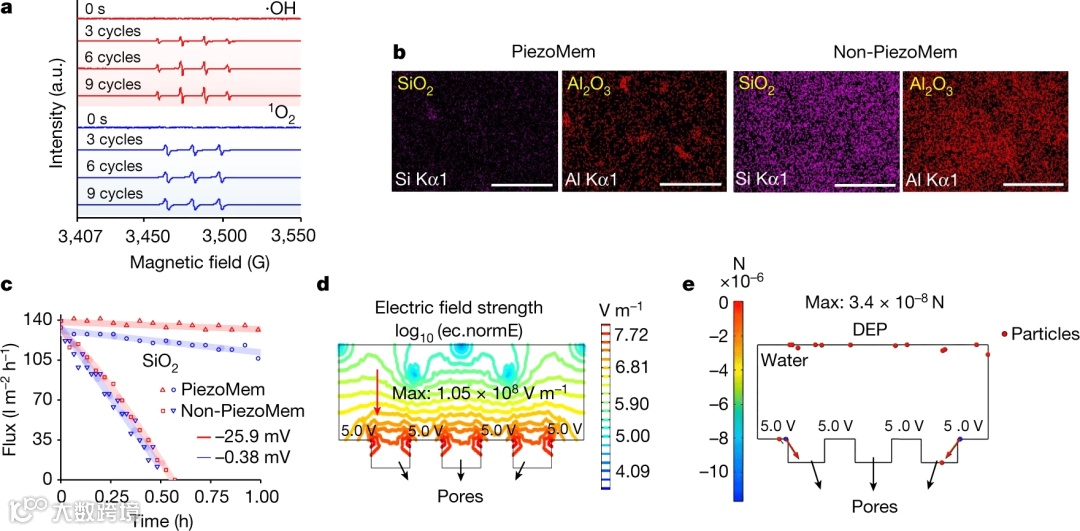 2. 此外,过滤后膜表面的电子显微镜和相应的元素图谱证实,与非PiezoMem相比,PiezoMem表面涂覆的所有污染物数量明显较少(图3d)。利用能量色散光谱(EDS)图像分析确定了膜表面被污垢覆盖的比例(f)和PiezoMem与非PiezoMem表面覆盖的比例(fPM/fnPM),即油为0.07,BSA为0.24,E.coli为0.31,SiO2为0.06,Al2O3为0.03。这支持了脉冲压力PiezoMem产生的瞬时电压可以普遍减少膜污染的假设,无论污垢的大小和电荷如何。