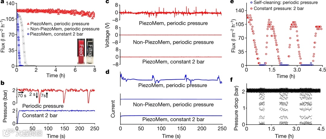 2. PiezoMem防污能力与零压力脉冲产生的瞬时电流脉冲和快速电压(+5.0/−3.2 V)振荡有关(图2c)。作为比较,本文在恒压下的PiezoMem和周期性脉冲下的非PiezoMem没有产生可检测到的瞬时电流或电压信号(图2c,d),这证实了压力脉冲和材料极化分别对原位膜污染减少的关键作用。这一结果表明,在死端结构中,通过短的零压力脉冲(2 s/7 s),可以可逆地从膜表面去除超过70 s累积的大部分油性污染物。