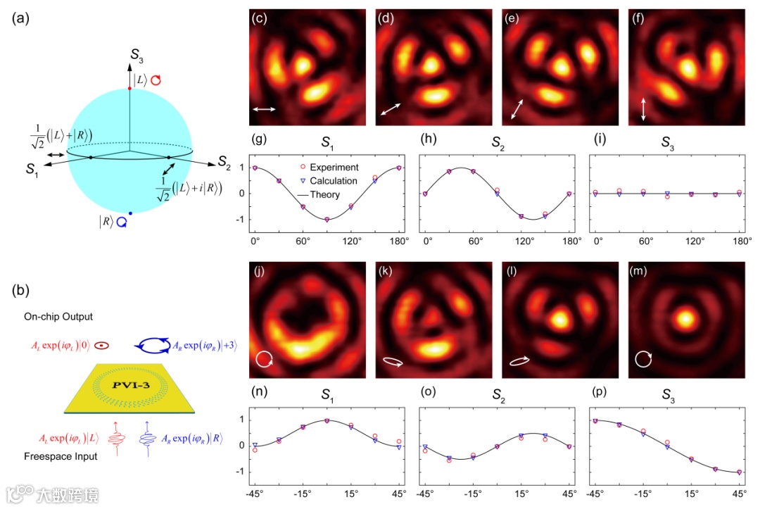 偏振代表着光的矢量特性,在光通信、传感、成像等领域有着非常重要的应用。为了确定一束光的偏振态,需要测量正交偏振分量的振幅和相位差,然而可见光或者红外频段的光学相位很难被直接测量。传统偏振测量需要调整一组偏振片或波片,从多次强度测量结果中反解光学相位,整体占用空间较大并且测量速度受限。研究团队基于所提出的激发方法构建片上表面等离激元干涉仪PVI-3,可以将入射光中的左、右旋圆偏振分量分别耦合为0阶和+3阶的表面等离激元涡旋,在不需要额外光学器件的前提下将完整偏振信息储存在表面等离激元干涉图案中(见图2)。实验结果与理论和计算结果吻合良好,归一化的S参数平均误差仅为0.06左右。