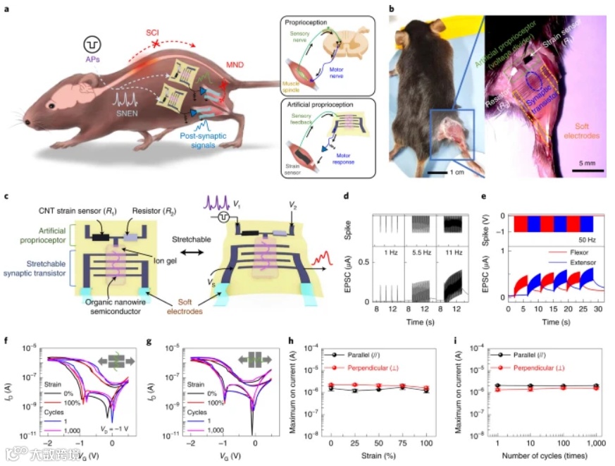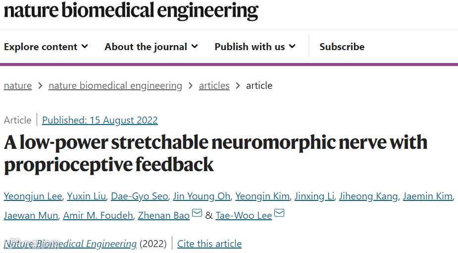 2022年8月15日,首尔国立大学Tae-Woo Lee及斯坦福大学鲍哲南共同通讯在Nature Biomedical Engineering(IF=29)在线发表题为“A low-power stretchable neuromorphic nerve with proprioceptive feedback”的研究论文,该研究报告了一种可拉伸的神经形态植入物,它可以恢复患有神经运动障碍的小鼠腿部的协调和平滑运动,使动物能够踢球、走路或跑步。