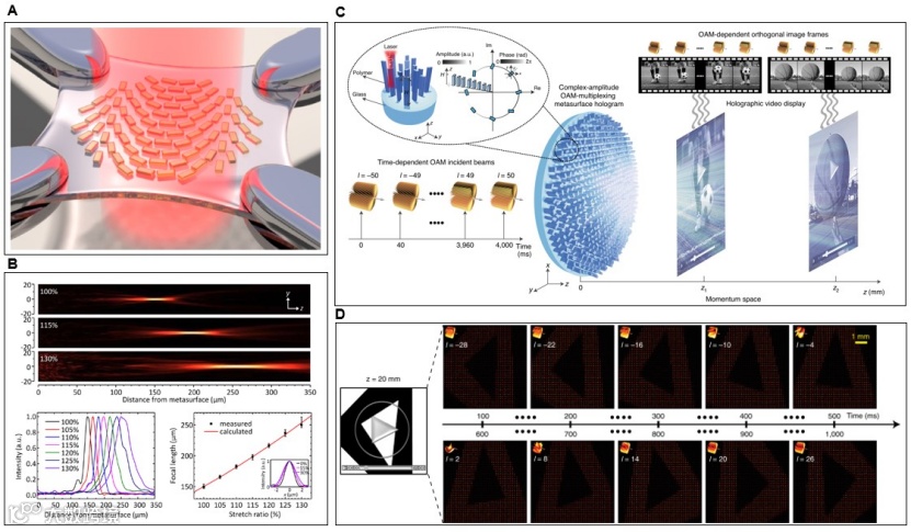 图2 具有代表性的可调谐超表面透镜和全息。(A)通过拉伸衬底来调节焦距的超表面透镜原理图。(B)根据不同拉伸比测量的纵向光束分布图(上);不同拉伸比透射交叉偏振光的强度分布(左下图);测量和计算的拉伸比焦距图(右下图)。(C)使用轨道角动量(OAM)的视频元全息图插图。(D)通过改变入射光的角动量改变图像