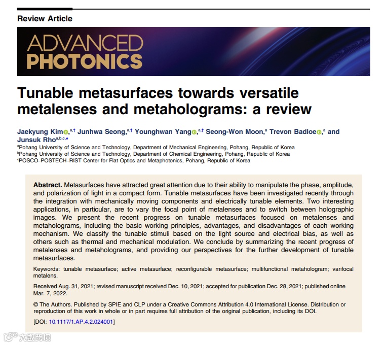 Advanced Photonics 特邀韩国浦项科技大学(POSTECH)的Junsuk Rho研究团队撰写应用于透镜和全息器件的动态可调谐超表面的综述文章。相关工作以Tunable metasurfaces towards versatile metalenses and metaholograms: a review为题发表于 Advanced Photonics 2022年第2期,是关注动态可调控超表面研究进展的必读。