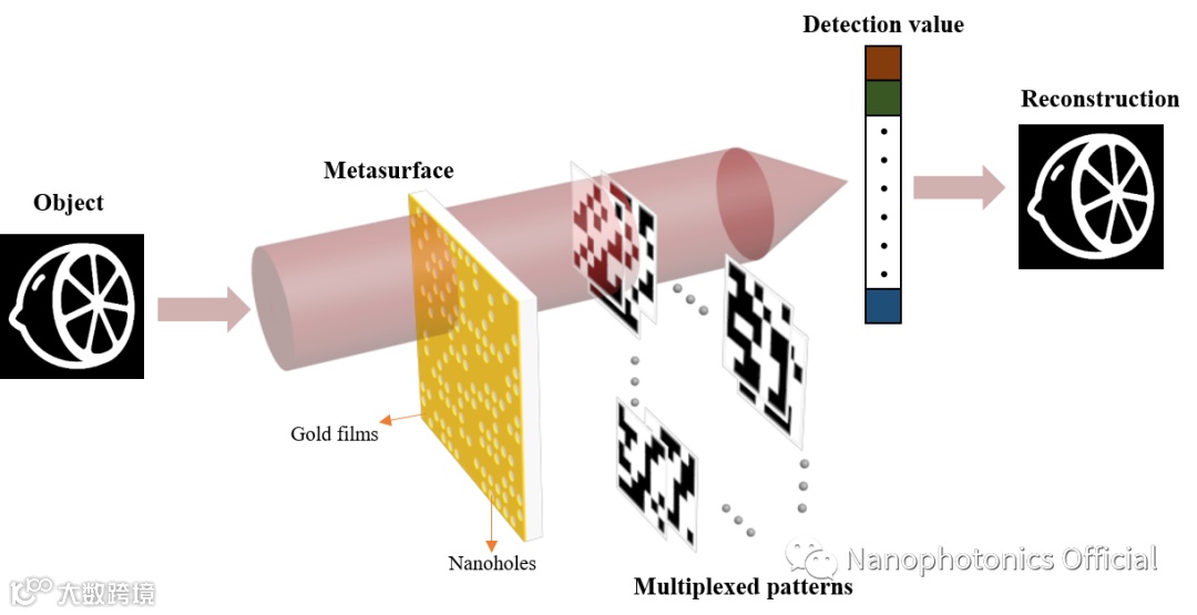针对这些问题,近日北京理工大学大学黄玲玲教授团队在Nanophotonics发表最新文章,提出了一套基于超颖表面的单像素成像方案,利用纳米孔结构单元的超颖表面实现了良好的二值振幅调制,通过在空间上的移动生成满足单像素成像所需数量的掩膜图案来实现图像的重建(见图1)。团队在理论模型分析和数值仿真模拟基础上,基于纳米孔结构单元的超颖表面能够在整个可见光波段到近红外波段进行良好工作。在可见光波段和高分辨成像方面进行了实验验证,实验结果均与理论预期非常吻合,充分证明了该设计方法的有效性。