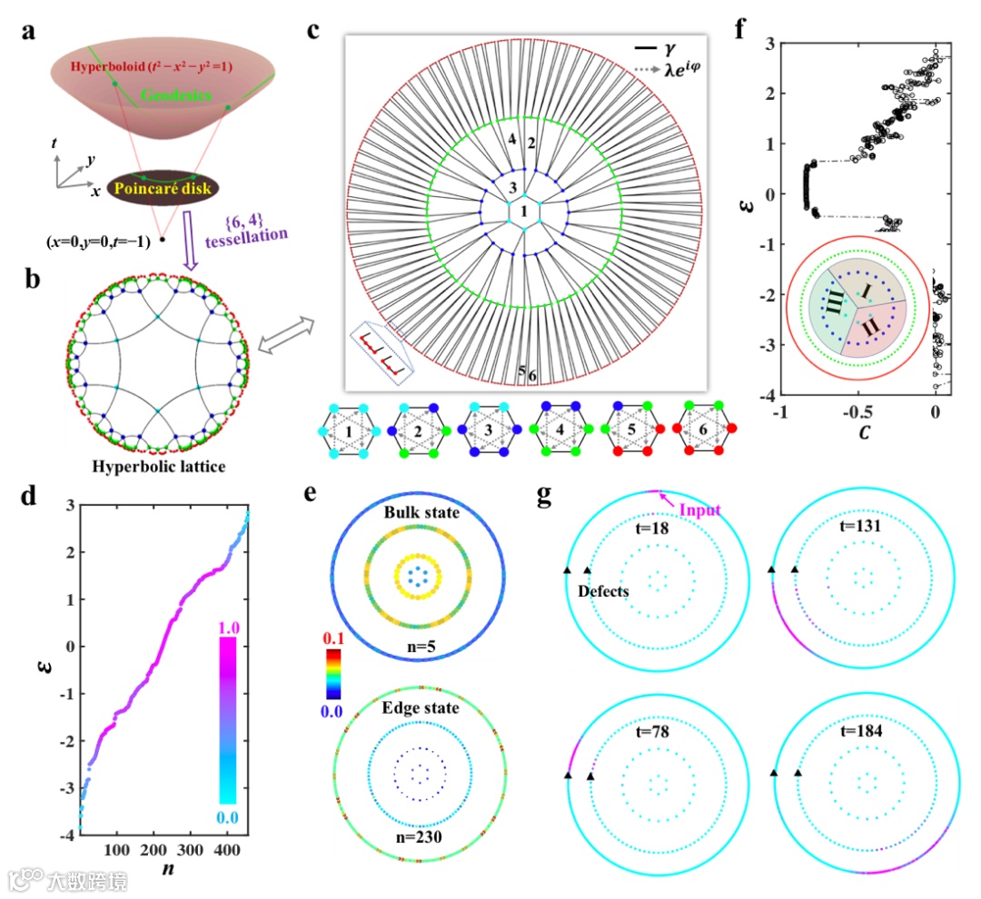 为了探究双曲几何和拓扑边界态的相互作用,研究人员首先将Haldane模型直接推广到{6,4}双曲晶格系统中,如图1a-1c所示。简单来讲,就是在{6,4}双曲晶格的每一个六边形结构中,都引入实数最近邻耦合和复数次近邻耦合。新生成的模型被称为双曲Haldane模型。通过直接数值对角化的方法,可以求得有限{6,4}双曲Haldane模型的本征能谱和相应的本征态分布,如图1d和1e所示。可以清晰的看到,能量为零附近的本征态为双曲边界态。为了进一步证明双曲边界态的拓扑属性,研究人员计算了实空间Chern数,如图1f所示。可以看到双曲边界态能谱所对应的实空间Chern数具有非平庸的拓扑平台,说明其具有类似于反常量子霍尔效应的拓扑属性。而实空间Chern数没有达到1是由于有限的格点数目导致的。进一步利用耦合模方程,研究人员研究了双曲边界态的单向拓扑传输特性,如图1g所示。可以清晰的看到,双曲拓扑边界态可以绕过缺陷单向传输。相比于欧氏空间的量子反常霍尔边界态,双曲拓扑边界态具有显著增强的边界响应,即拓扑传输的通道(边界点)数目大于或近似等于体内格点的数目。这一新奇的特性为设计高效的拓扑器件提供了新的途径。