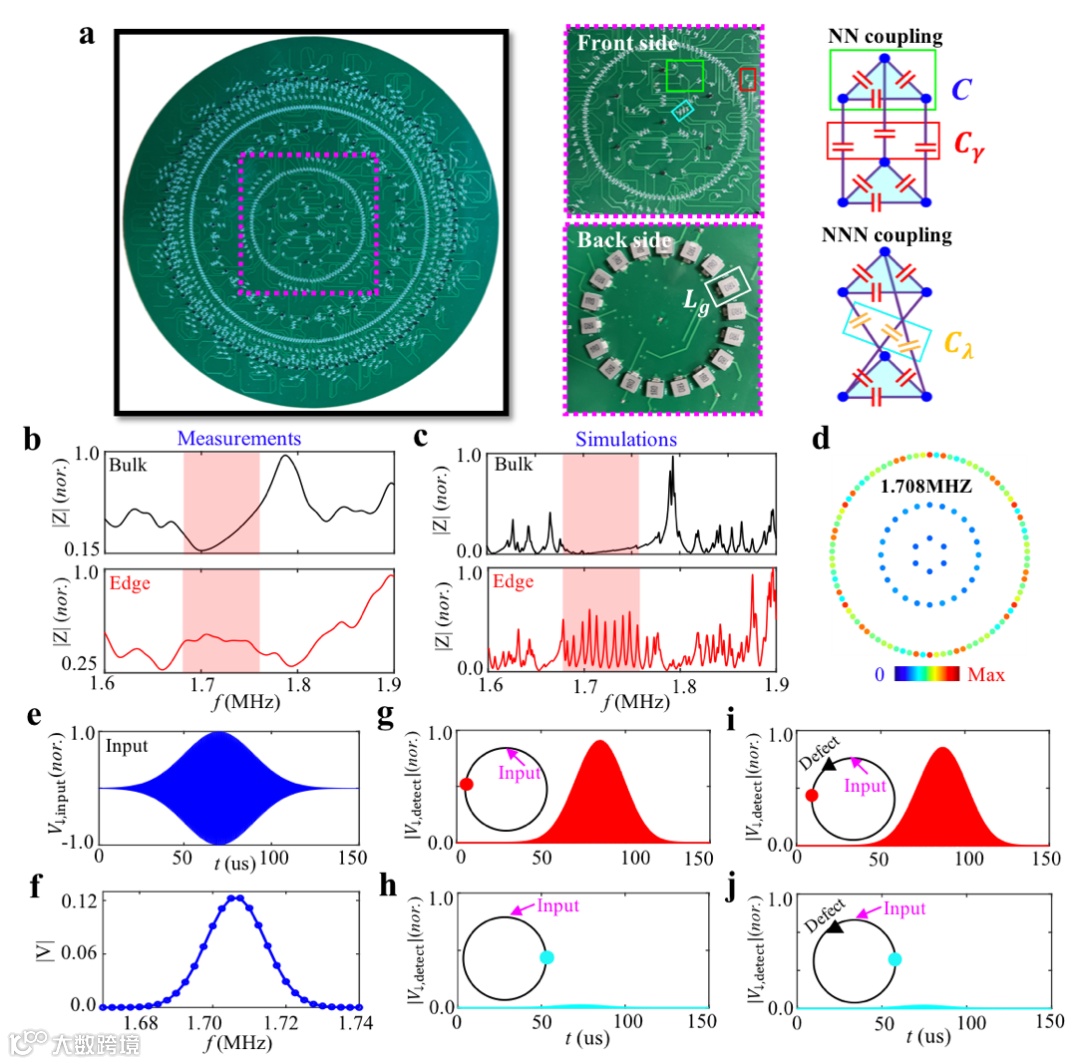 基于凝聚态晶格模型与电子线路网路的一致性,研究人员设计并制备了双曲电路(如图2a所示)来观察边界统治的双曲量子反常霍尔效应。图2b和2c分别对应实验测量和理论仿真的电路阻抗结果。电路格点的阻抗响应对应于双曲量子模型的局域态密度。可以看到,双曲体点在红色区域内没有阻抗峰值,表明存在双曲体带带隙。同时,双曲电路的边界格点在该带隙中存在显著的阻抗峰值,表明拓扑边界态的存在。图2d展示的是边界态所对应频率下的电路阻抗分布图。可以看出其与双曲晶格模型中的拓扑边缘态的概率幅分布完全一致。进一步,研究人员通过测量电压波包在双曲电路网路中的时域特性,清晰地证明了边界统治的双曲边界电压传输,如图2e-2j所示。