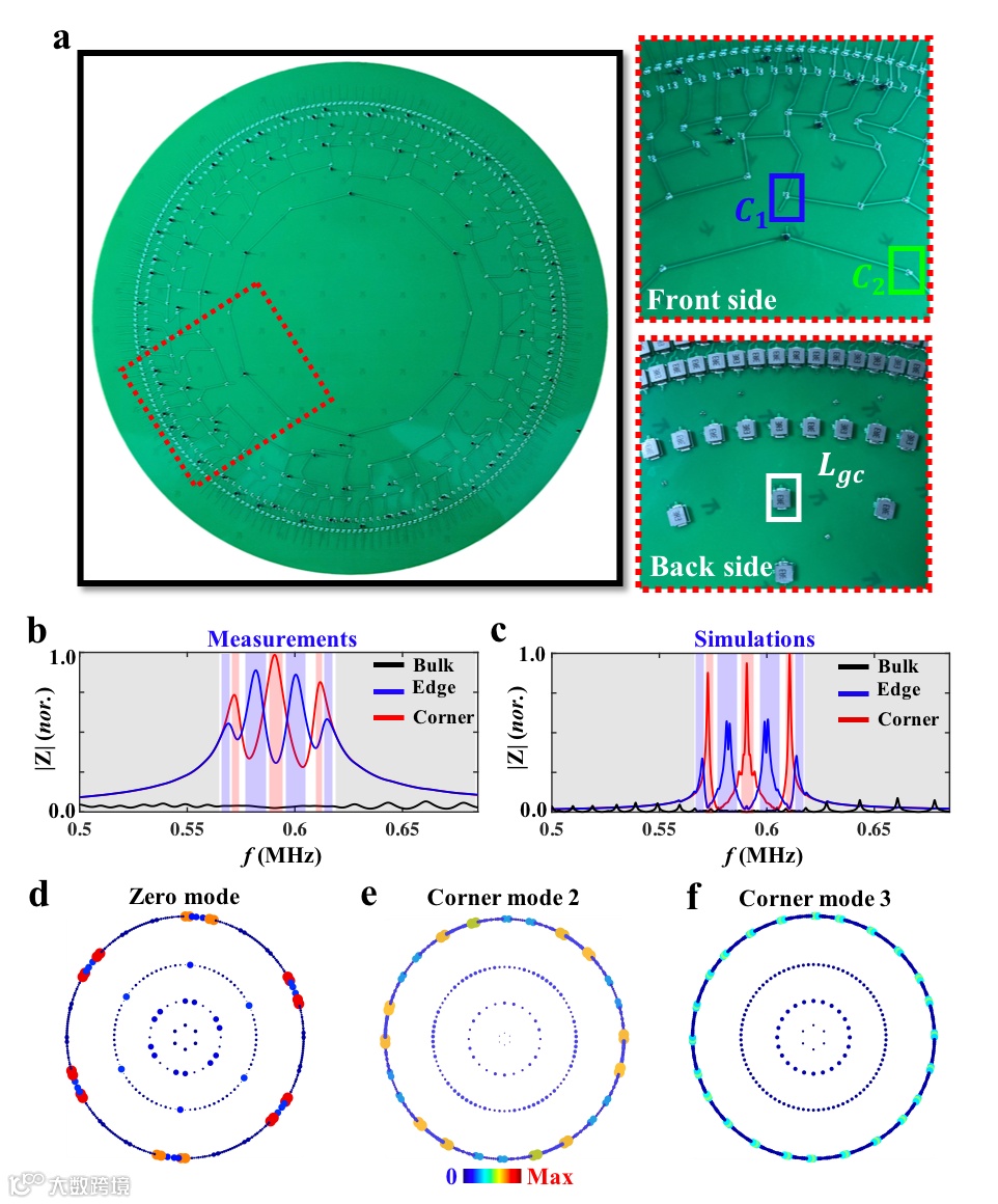 为了在实验上观察双曲高阶零能角态,研究人员设计并制备了相应的双曲电路网络,如图4a所示。图4b和4c分别对应实验测量和理论仿真的电路阻抗结果。可以看到双曲晶格的边界点在蓝色区域所对应的频率范围内有显著的阻抗峰值,而体点在相应频率范围没有阻抗响应,表明双曲边界态存在于双曲体态的带隙中。同时双曲晶格的角点在红色区域内有显著的阻抗峰值,而边界格点在该频率范围没有阻抗峰值。这一现象表明双曲高阶角态存在于双曲边界态的带隙中。为了进一步展现不同双曲高阶角态的空间分布,研究人员对电路的导纳矩阵进行了重构,并利用重构的导纳矩阵得到了不同双曲高阶角态的空间分布图,如图4d所示。可以看出测得的高阶角态分布与双曲晶格模型的结果完全一致。
