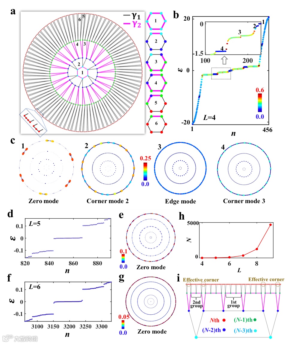 除了一阶双曲量子反常霍尔边界态,研究人员进一步研究了双曲晶格中的高阶零能角态。所设计的双曲晶格模型显示在图3a中,即在{6,4}双曲晶格中引入二值化(黑线和粉线)的层内和层间最近邻耦合。当最外层的耦合强度对应于弱耦合时,高阶角态就会产生。需要指出的是,不同于欧氏空间中0维角点的几何特性,双曲晶格的有效0维角点对应于具有不同耦合方式的最外层格点间的有效界面(如图3i所示)。图3b和3c展示了利用数值对角化方法计算的双曲能谱和相应本征态的空间分布。可以看到双曲零能模的概率分布局域在最外层的0维格点上,展现了高阶拓扑角态的特性。同时,除了零能模,在另外两个能量附近也存在双曲高阶角态。可以发现与欧氏空间的高阶角态性质相似,双曲高阶角态也总是出现在双曲边界态的带隙中。研究人员从三个方面进一步对高阶零模的拓扑性质进行了证明。首先,通过改变二值化耦合强度的相对关系,双曲能谱发生了带隙闭合再打开的过程。同时,该过程伴随着双曲高阶零能模从无到有的变化过程,是拓扑相变的重要特征。其次,双曲高阶拓扑态具有与C6-高阶拓扑绝缘体相同的拓扑相变特点。最后,通过引入无序可以发现双曲高阶零能角态具有很强的鲁棒性,这与双曲晶格中由干涉引起的局域化效应显著不同。另外研究人员计算了不同尺寸下的双曲能谱和本征态的分布,如图3d-3g所示。图3h给出了双曲零能模的数量与双曲晶格尺寸的关系。可以看到通过增大双曲晶格的尺寸,双曲零能模式的数量也急剧增加。该现象与分形几何结构中的高阶拓扑角态相似。需要强调的是,这一新奇的现象是源于双曲晶格独特的边界响应,即边界格点的数目随双曲晶格层数的增加而呈现指数增长的趋势,使得边界有效0维角点也具有指数增长的特点。