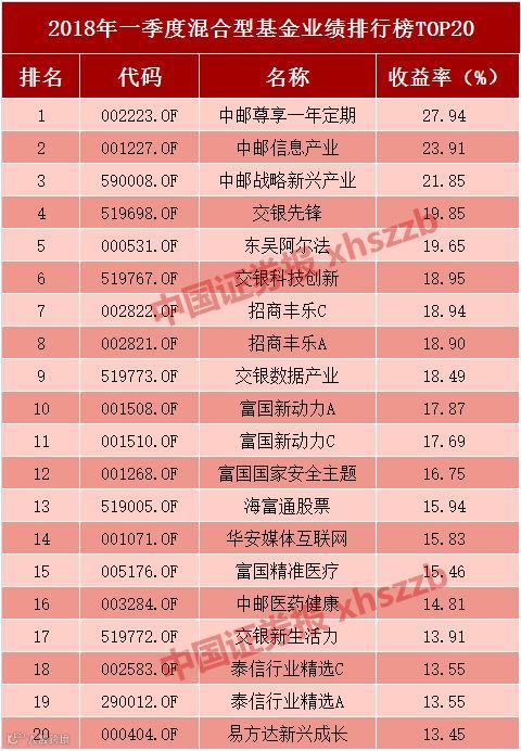 混合型基金中,中邮基金成为最大赢家。中邮尊享一年定期、中邮信息产业、中邮战略新兴产业高居前三甲,一季度涨幅均超过21%。可见随着市场风格的变化,中邮旗下基金迎来翻身机会。交银先锋、东吴阿尔法涨幅排在第四、五名,涨幅也接近20%。