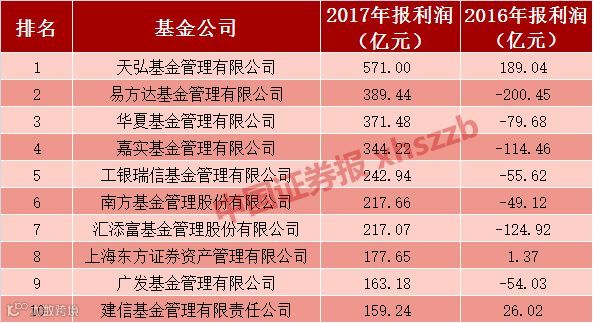 2017年,基金公司业绩强劲。金牛理财网提供的数据显示,天弘基金高居利润榜首位,旗下基金全年利润高达571亿元。易方达、华夏、嘉实紧随其后,全年利润均超过300亿元。