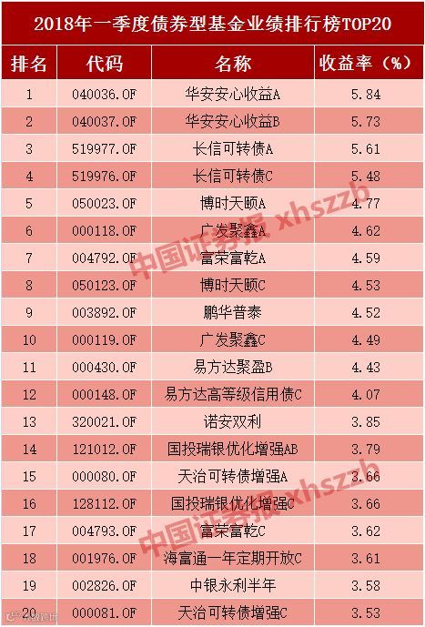 债券型基金今年有所回暖。一季度净值增长率最高的是华安安心收益A,达到5.84%。
