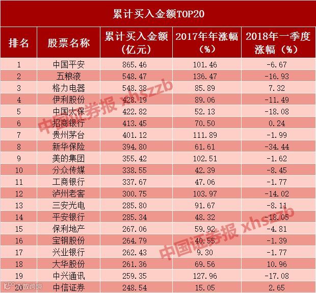 金牛理财网统计数据显示,2017年基金累计买入居前十的股票分别是:中国平安、五粮液、格力电器、伊利股份、中国太保、招商银行、贵州茅台、新华保险、美的集团、分众传媒。 此外,工商银行、平安银行等银行股以及泸州老窖等消费领域的股票也是基金买入居前的品种。