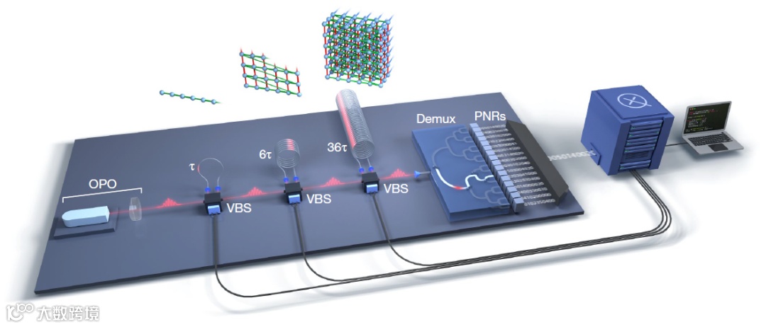 图1 可编程光子处理器的高维高斯玻色取样流程。脉冲OPO的单模压缩状态的周期脉冲进入三个动态可编程环式干涉仪序列。每个环路包含一个VBS,包括一个可编程移相器,和光纤延迟线。在干涉仪的输出端,高斯态被发送到一个1到16的二进制开关树(demux),该树在光子计数器读取之前对输出进行部分解复用。