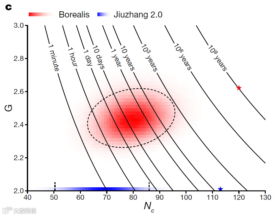 此外,研究人员绘制了每个样本的经典模拟时间分布图,以星形表示运行时间最大的样本。并与九章2.0的算力进行了比较。他们表示该实验模拟的难度比之前高7个数量级,而且Borealis不会被当前最先进的贪婪算法或交叉熵中的经典高斯态欺骗。