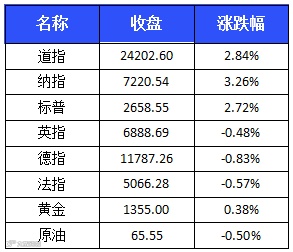 中美贸易战担忧情绪降温,美国三大股指周一大幅上涨。标普500指数收涨2.72%,报2658.55点。 道指收涨669.40点,涨幅2.84%,报24202.60点。 纳指收涨3.26%,报7220.54点。
