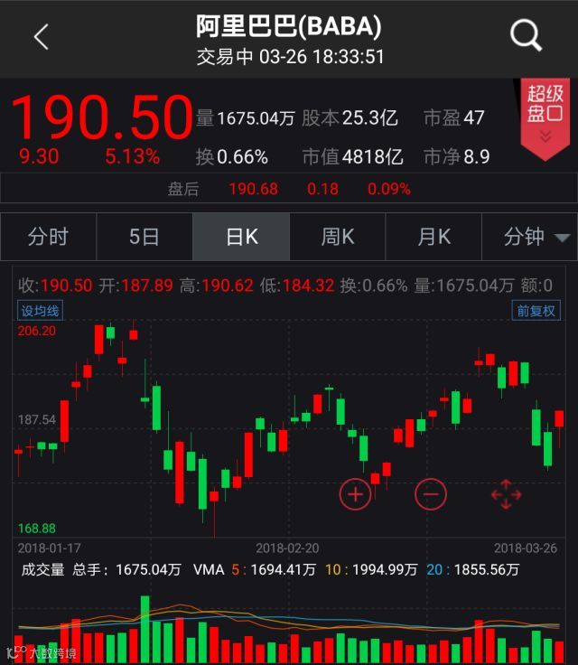 中国概念股周一收盘涨跌互现,阿里巴巴大涨5.13%报收190.50美元,百度上涨2.55%报收235.94美元,京东上涨2.40%报收41.85美元;宝尊电商飙涨7.39%报收48.08美元,中芯国际上涨7.22%报收6.68美元;拍拍贷下跌8.81%报收7.25美元,无忧英语重挫12.17%报收10.54美元。