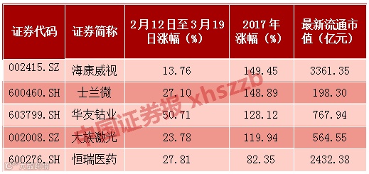 据wind数据统计,剔除2016年11月之后上市的新股,去年涨幅超过30%的267只个股中,有36只个股在2月12日以来的反弹中股价创出新高。其中不乏片仔癀、爱尔眼科、恒瑞医药等自去年初即进入上涨趋势的股票,恒瑞医药今日更是强势上涨5.37%,股价创新高。值得注意的是,在这36只个股中,有25只个股的流通市值超过200亿元,占比近70%,仅有5只个股流通市值在100亿元以内。