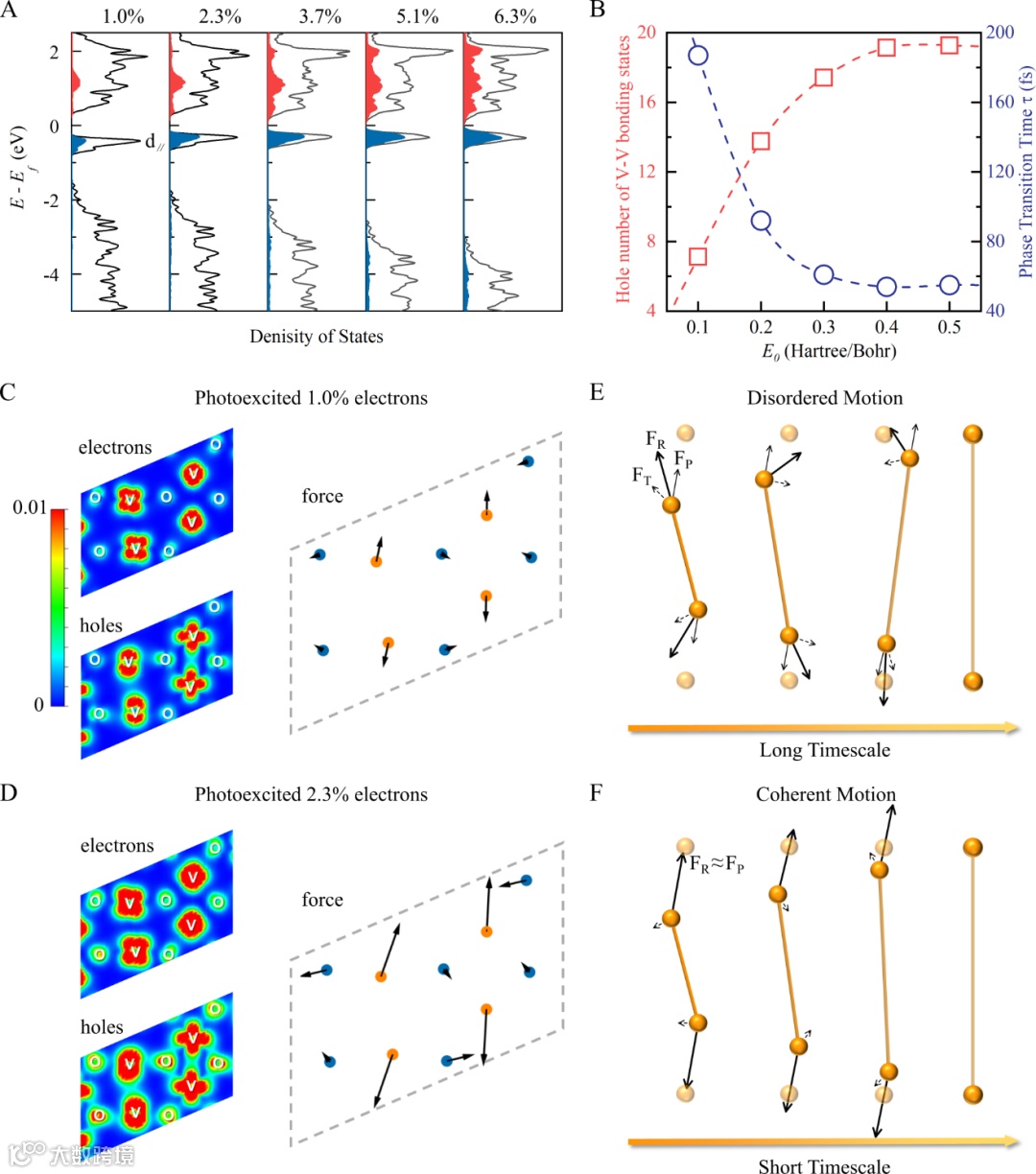 面上光激发引起的空穴、电子和驱动力的实空间分布,(C) 光激发1.0% 价电子的情况,(D) 光激发的 2.3% 价电子的情况。(E) 由多个声子引起的原子无序运动。(F) 强光激发引起的原子相干运动。橙色球代表一对 V-V 原子。FP 表示由光激发引起的驱动力, FT表示由热振动引起的受力(虚线箭头), FR表示合力(黑色实线箭头)。