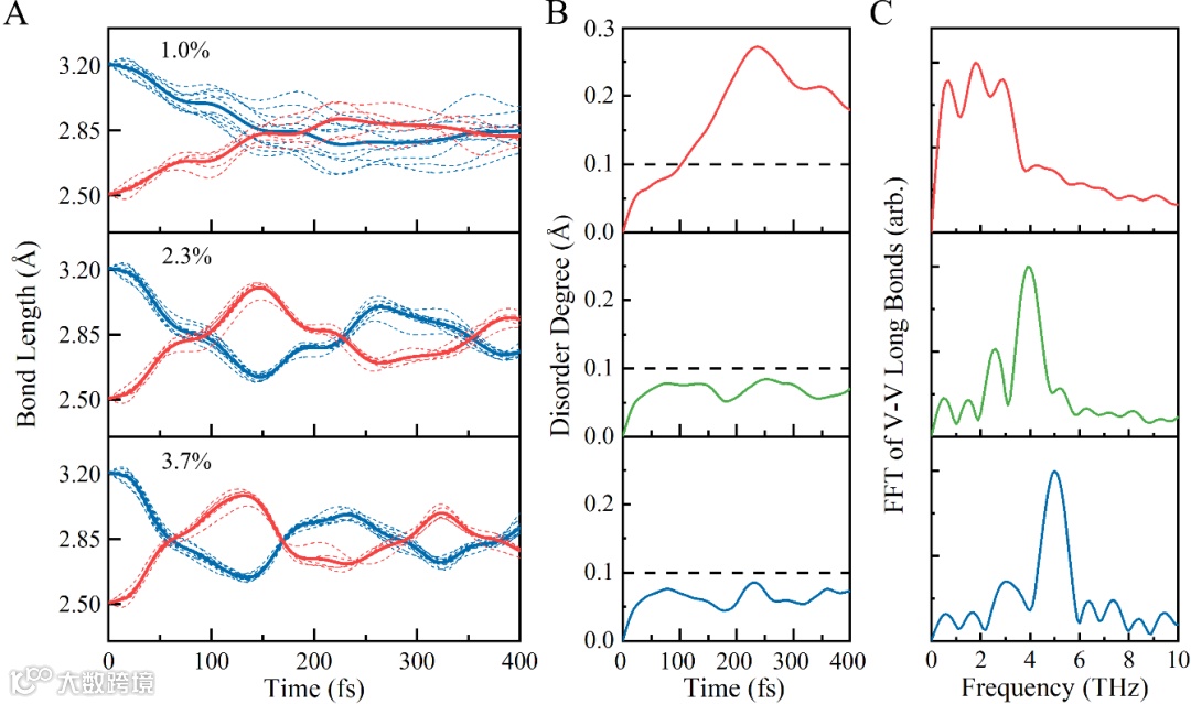 图2. 不同电子激发下的光致超快相变过程。(A) 键长随时间的演化。蓝色和红色分别代表长键和短键的键长。(B) 原子无序度的演化。(C) V原子在相变过程中的声子模式,通过V-V 键长的快速傅里叶变换 (FFT)得到。