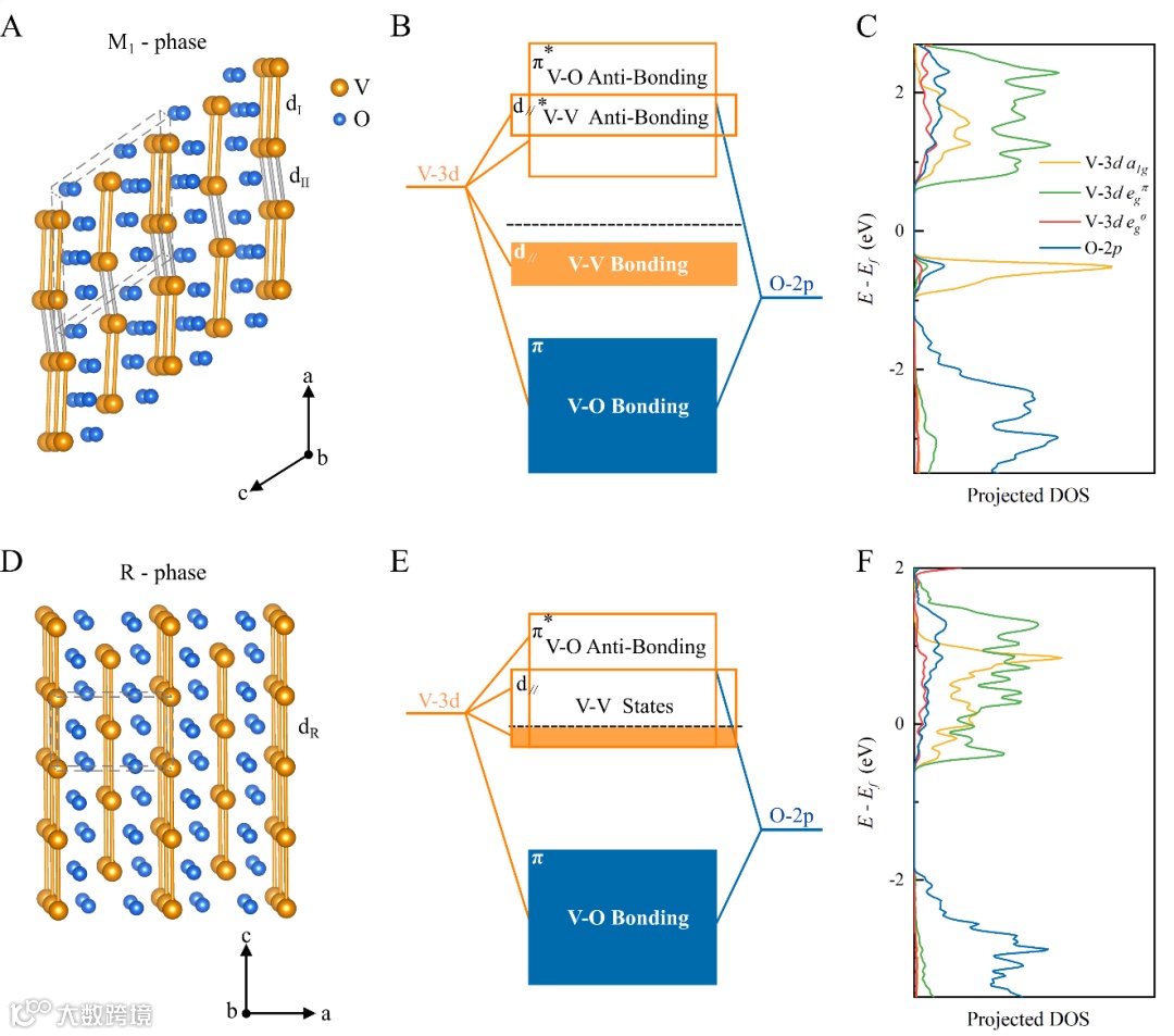 图1. VO2 原子和电子结构。(A) M1相的超胞结构,其中 dI 和 dII 代表V-V长键和短键。灰色的平行六面体代表结构的晶胞。(B) M1 相的成键态和反键态的示意图。(C) M1相的投影状态密度 (PDOS)。(D) R 相的超胞结构,其中所有 V-V 键 (dR) 相等。(E) R 相 的成键态和反键态的示意图。(F) R 相的投影状态密度 (PDOS)。