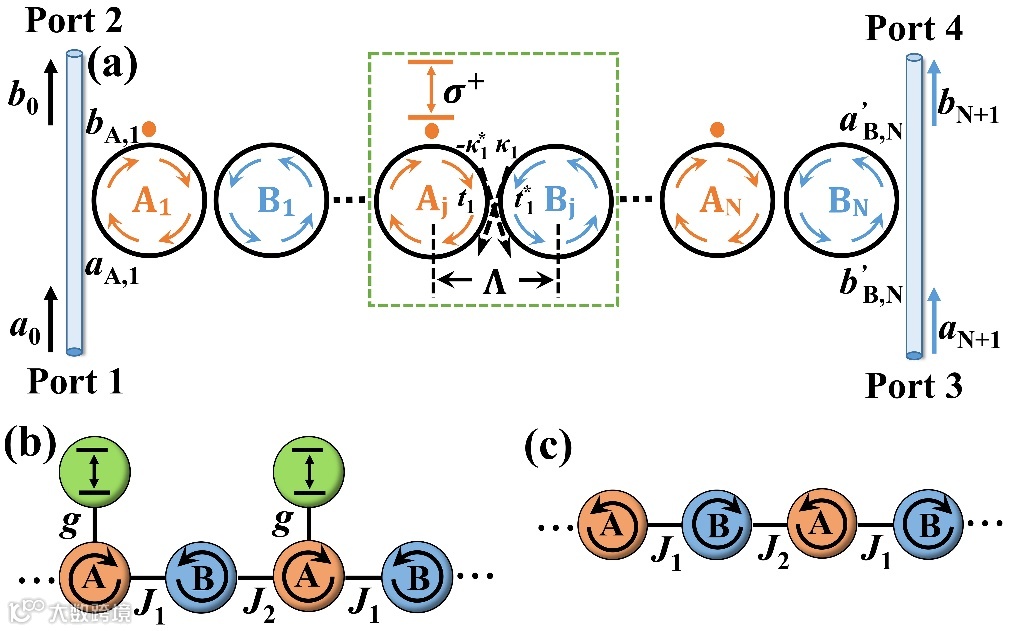 极化跃迁的QEs周期性耦合A子晶格的顺时针模式。(b) 正向入射情况下表现L型三聚体链特征。(c) 反向入射情况下表现二聚体链特征。