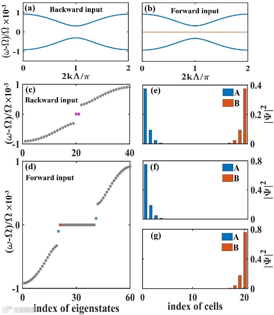 图2(a, b) 非互易能带结构,其中(a)对应反向激发,(b)对应正向激发;(c, d)非互易能谱,其中(c)对应反向激发,(d)对应正向激发;(e-g)边界态元胞概率分布,其中(e)对应反向激发,(d, e)对应正向激发。
