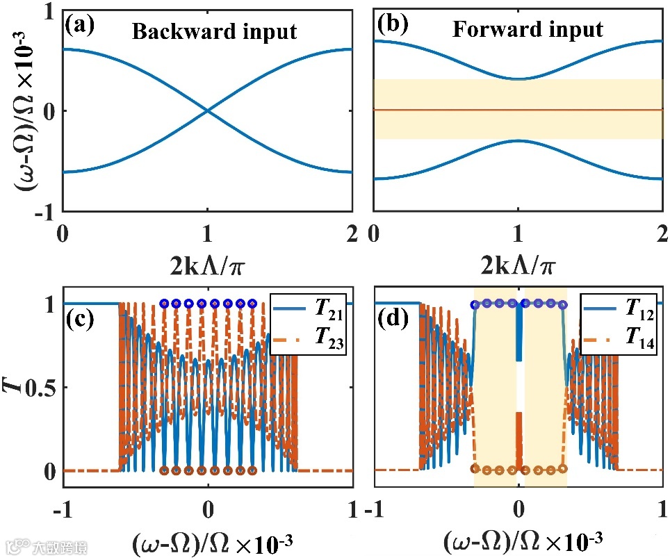 图3(a, b)非互易单光子带隙,其中(a)对应反向激发,(b)对应正向激发;(c,d) 非互易透射谱。