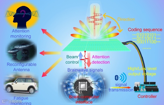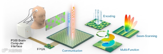 基于此,崔铁军教授、李远清教授、仇成伟教授、李廉林教授、屈绍波教授和王甲富教授等提出了利用非侵入式的脑机接口获取人脑的意识,转化为电磁波信息,控制超材料的动态编码。崔铁军教授、李远清教授、仇成伟教授、李廉林教授等将转化的电磁波信号远程传输,并进一步转化为可被接收端人脑识别的信息。