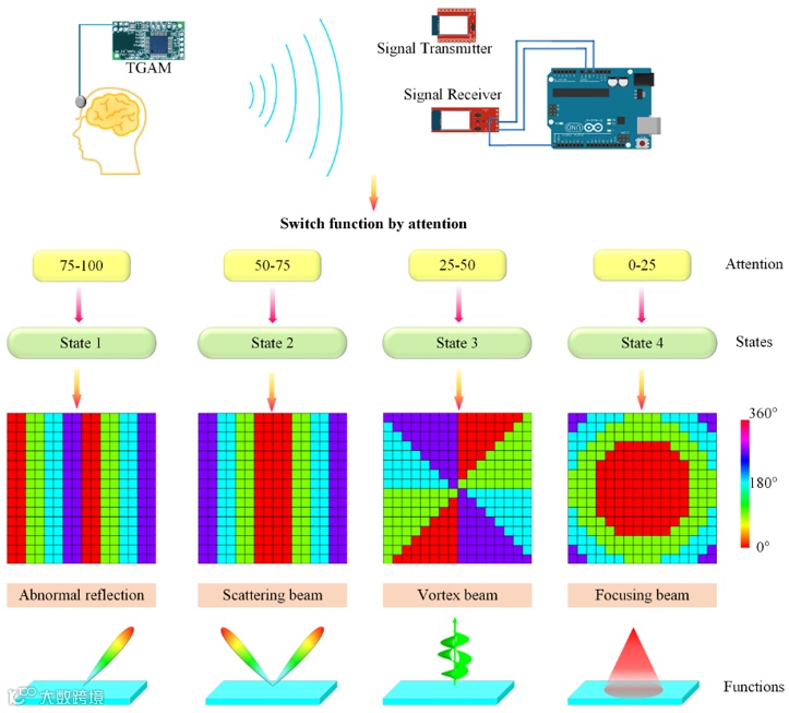 空军工程大学 王甲富 教授、屈绍波 教授和新加坡国立大学 仇成伟 教授等在《eLight》上发表了研究论文“Remotely Mind-controlled Metasurface via Brainwaves”,提出了一种利用脑电波提取模块实现意念控制超表面的框架。