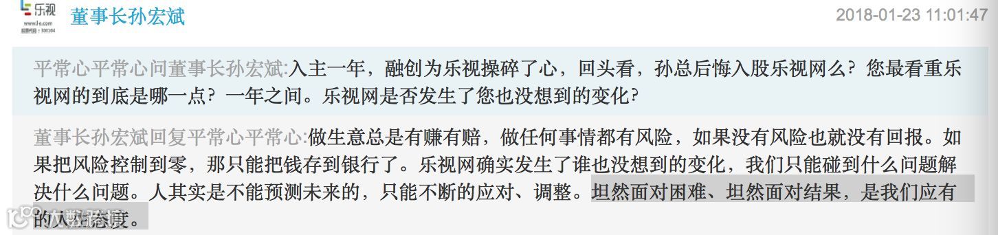 还有投资者问,孙宏斌能否接手老贾的股份?从投资者的角度,也许是希望融创系彻底接手乐视网,给公司带来新的“生机”。