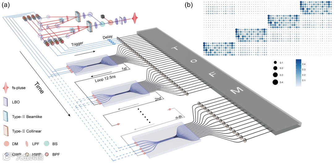 研究团队通过多组SPDC光源在循环结构的光子芯片中的干涉验证了该方案。多光子SPDC光源经光纤耦合器收集后注入到集成光子芯片,通过扩大时间循环次数,光子数和模式数可以扩大N倍。光子芯片的自循环结构保证了不同时间块之间也能发生量子干涉效应。时间飞行模块记录下了巨大希尔伯特空间中所有光子事件的时间信息,并用于提取出射光子概率分布。时间上随机散射输出的光子概率分布结果成功和经典可分辨采样器区分。通过增加时间块,问题被扩展至200,000光子在750,000模式中散射,并且成功还原出了片上56光子事件,达到了「量子优越性」的范畴。本工作展示了一种光子系统中集成且成本效益高的迈向「量子优越性」的新途径,并提供了一种可控可拓展的新平台,可用于极大希尔伯特空间中的量子模拟。