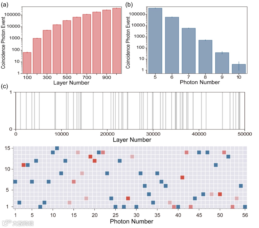 图3 | 片上56光子事件示例。灰色柱子代表光子事件所在的时间层,红色方块代表不同时间层之间的光子干涉。
